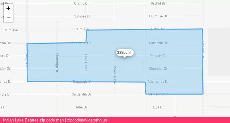 Indian Lake Estates City is a small town located in the United States, and its official zip code is 33855. Below is a map displaying the geographic location and boundaries of above Zip Code. The map showcases the specific region within the United States where Indian Lake Estates City is located, and it provides an understanding of the town's location relative to nearby cities and states.