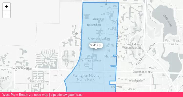West Palm Beach City is a small town located in the United States, and its official zip code is 33417. Below is a map displaying the geographic location and boundaries of above Zip Code. The map showcases the specific region within the United States where West Palm Beach City is located, and it provides an understanding of the town's location relative to nearby cities and states.